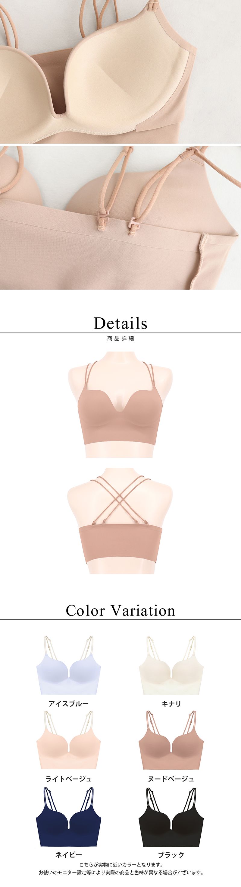 | ストラップ取り外し:背面のみ取り外し可(3way仕様) ストラップ長さ調節:有り パッド取り外し:不可 ワイヤー:無し ホック:無し 透け感:無し 素材:ナイロン・ポリウレタン・その他 |