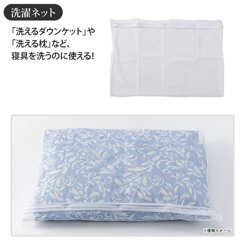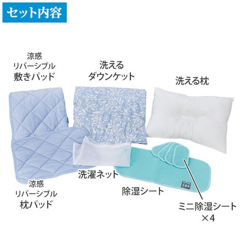 「洗えるダウンケット」・「涼感リバーシブル敷きパッド」・「涼感リバーシブル枕パッド」・「洗える枕」の寝具4点に、洗うのに必要な「洗濯ネット」をプラス。