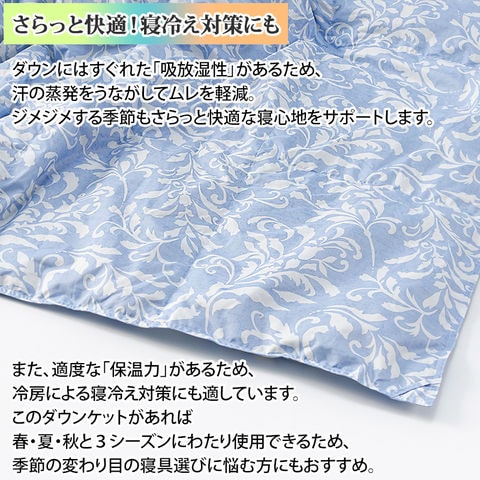 このダウンケットがあれば春・夏・秋と3シーズンにわたり使用できるため、季節の変わり目の寝具選びに悩む方にもおすすめ。