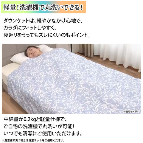 ダウンケットは、軽やかなかけ心地で、カラダにフィットしやすく、寝返りをうってもズレにくいのもポイント。