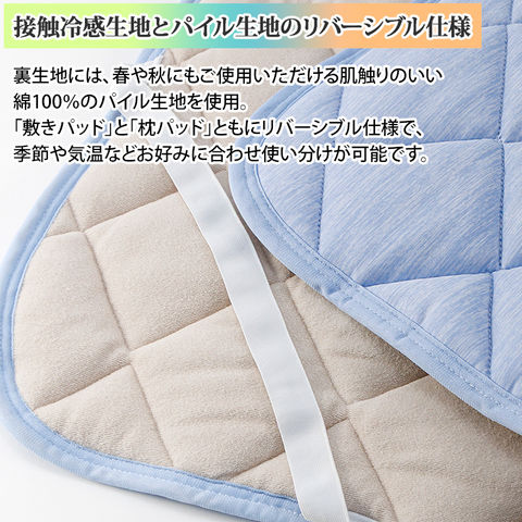 「敷きパッド」と「枕パッド」ともにリバーシブル仕様で、季節や気温などお好みに合わせ使い分けが可能です。