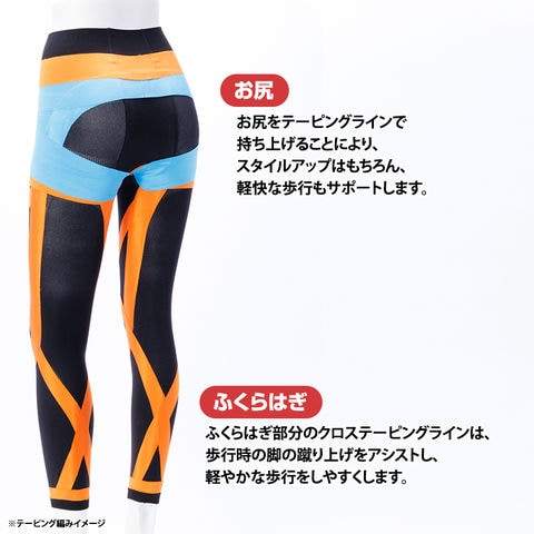 お尻をテーピングラインで持ち上げることにより、スタイルアップはもちろん、軽快な歩行もサポートします。