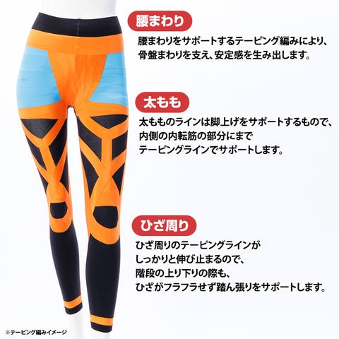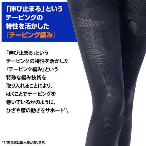この「伸び止まる」というテーピングの特性を活かした「テーピング編み」という特殊な編み技術を取り入れることにより、はくことでテーピングを巻いているかのように、ひざや腰の動きをサポート(*1)。