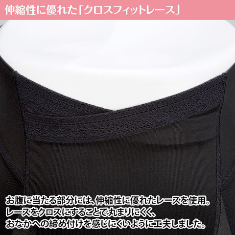 さらにおなかにクロスして当たる生地には、伸縮性に優れた「クロスフィットレース」を使用。丸まりにくく、おなかへの締め付けを感じにくいように工夫しました。