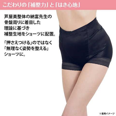 芦屋美整体の納富先生の骨盤周りに着目した理論に基づき補整生地をショーツに配置。「押さえつける」のではなく「無理なく姿勢を整える」ショーツに。はくだけで骨盤周りを正しい位置へとサポートします。
