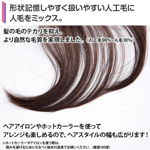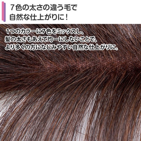 1つのカラーに7色をミックスし、髪の太さもあえて均一にしないことで、より多くの方になじみやすい自然な仕上がりに。また、形状記憶しやすく扱いやすい人工毛に人毛をミックスすることで、髪の毛のテカリを抑え、より自然な毛質を実現しました。(人工毛90%・人毛10%)