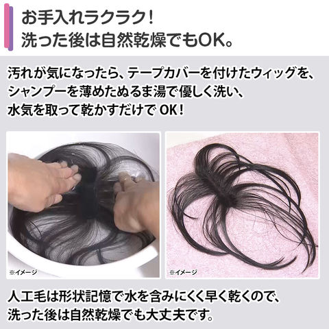 汚れが気になったら、テープカバーを付けたウィッグを、シャンプーを薄めたぬるま湯で優しく洗い、水気を取って乾かすだけで OK!人工毛は形状記憶で水を含みにくく早く乾くので、洗った後は自然乾燥でも大丈夫です。手軽にお手入れができるので、普段から気軽にお使いいただけます。