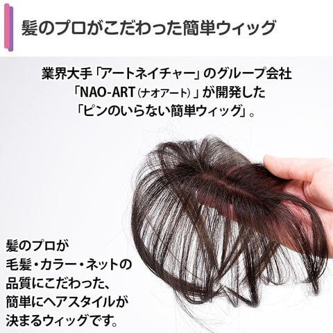 業界大手「アートネイチャー」のグループ会社「NAO-ART(ナオアート)」が開発した「ピンのいらない簡単ウィッグ」。ポンとつけて手ぐしでサッとなじませるだけ!分け目の伸びた白髪や、毛量が減った分け目やつむじ、頭頂部の薄毛など、髪のお悩みを超簡単にカバーできちゃうアイテムです。