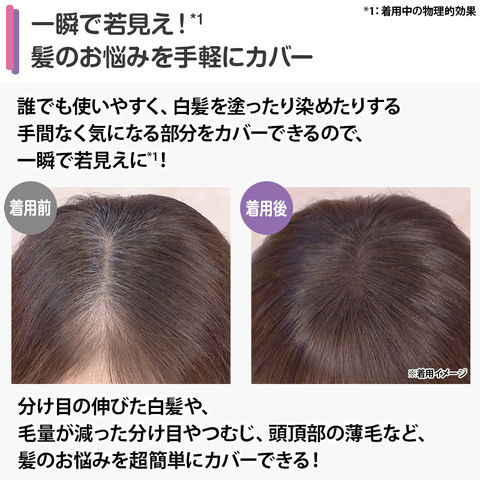 頭にポンとつけるだけだから、日々の外出時にはもちろん、急な来客や旅行などのイベントにも便利。伸びてしまった分け目の白髪が気になる時、美容室に行くまでのつなぎとしてお使いいただくのもオススメです。