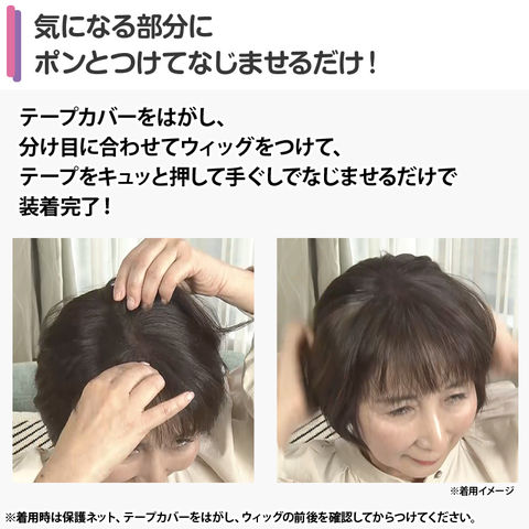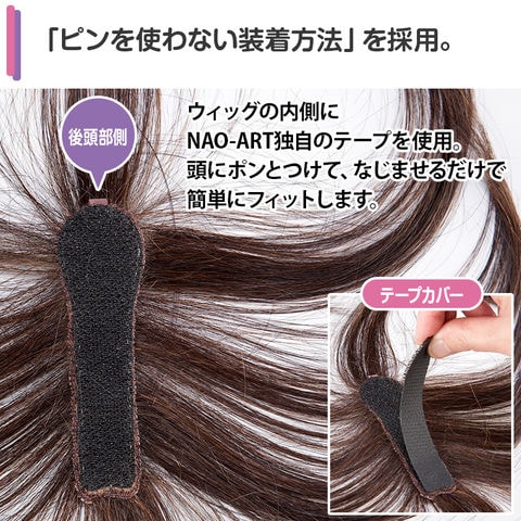 ウィッグの内側にNAO-ART独自のテープを使用しており、分け目に合わせてウィッグをつけて、テープをキュッと押して手ぐしでなじませるだけで装着完了!(※着用時は保護ネット、テープカバーをはがし、ウィッグの前後を確認してからつけてください。)