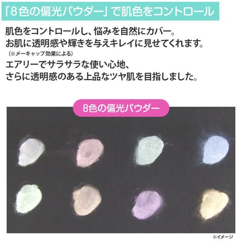 その秘密は配合された「8色の偏光パウダー」。肌色をコントロールし、悩みを自然にカバー。お肌に透明感や輝きを与えキレイに見せてくれます。(※メーキャップ効果による)