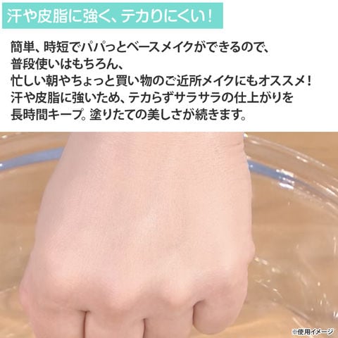 簡単、時短でパパっとベースメイクができちゃうので、普段使いはもちろん、忙しい朝やちょっと買い物のご近所メイクにもオススメです。汗や皮脂に強いため、テカらずサラサラの仕上がりを長時間キープ。塗りたての美しさが続きます。