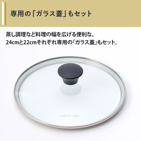 蒸し調理などにも便利な、24cmと22cmそれぞれ専用の「ガラス蓋」もセットにしてお届けします。