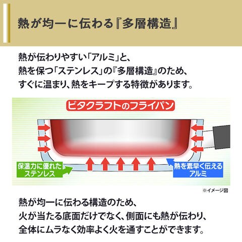 『ビタクラフトフライパン』は、熱が伝わりやすい「アルミ」と、熱を保つ「ステンレス」の『多層構造』のため、すぐに温まり、熱をキープする特徴があります。