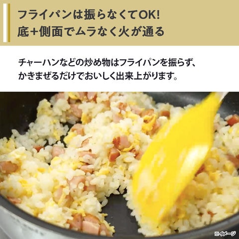 『ビタクラフトフライパン』は熱が均一に伝わる構造のため、火が当たる底面だけでなく、側面にも熱が伝わり、全体にムラなく効率よく火を通すことができます。そのため、チャーハンなどの炒め物はフライパンを振らず、かきまぜるだけでおいしく出来上がります。