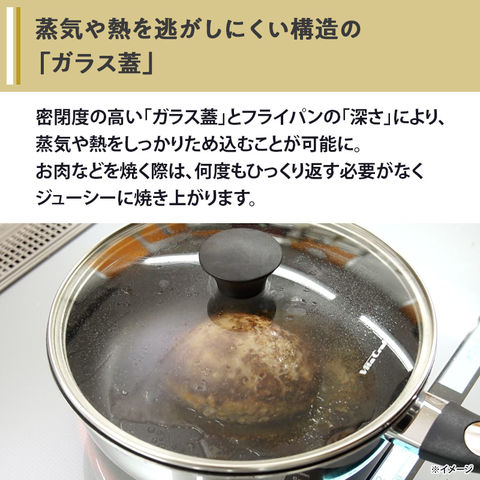 そのため、密閉度の高い「ガラス蓋」とフライパンの「深さ」により、蒸気や熱をしっかりため込むことが可能に。お肉などを焼く際は、何度もひっくり返す必要がなくジューシーに焼き上がります。