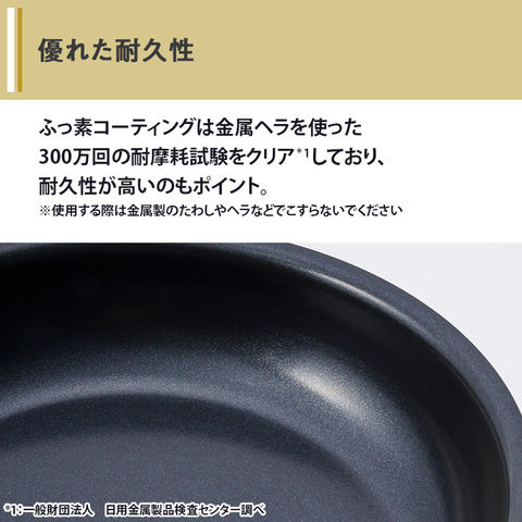 内面のふっ素コーティングにより、こびりつきにくいのも魅力のひとつ。 コーティングには「高熱圧着法」を採用しており、本体とふっ素コーティングを高熱でプレスし密着度を高めました。このふっ素コーティングは金属ヘラを使った300万回の耐摩耗試験をクリア(*1)しており、耐久性が高いのもポイント。