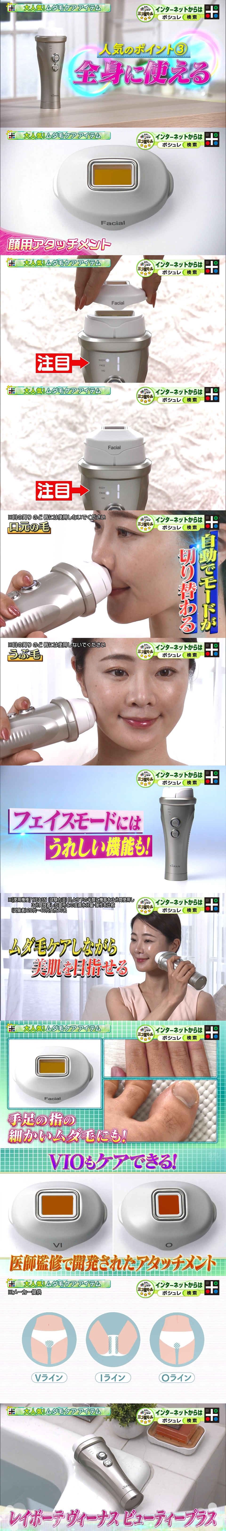 これ一台あれば気になるウデ、アシ、ワキ、顔まわり、VIOまで、全身の気になるムダ毛が最短3分程度(*3)でケアできちゃう「レイボーテ ヴィーナス ビューティープラス」