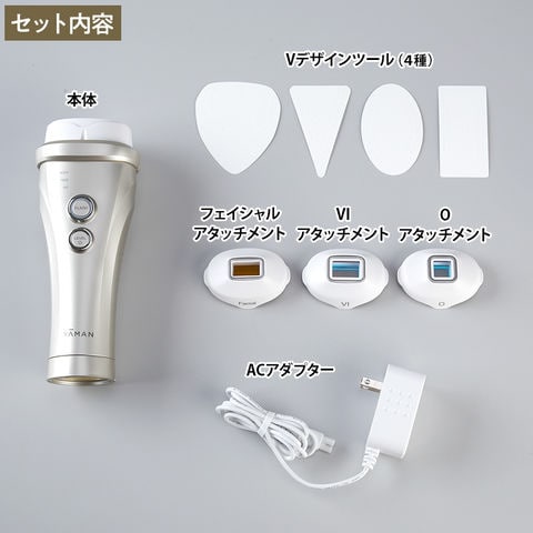本体、フェイシャルアタッチメント×1、VIアタッチメント×1、Oアタッチメント×1、Vデザインツール×1セット、ACアダプター×1、取扱説明書(保証書付)、チラシ(注意ペラ、カラーチャート)