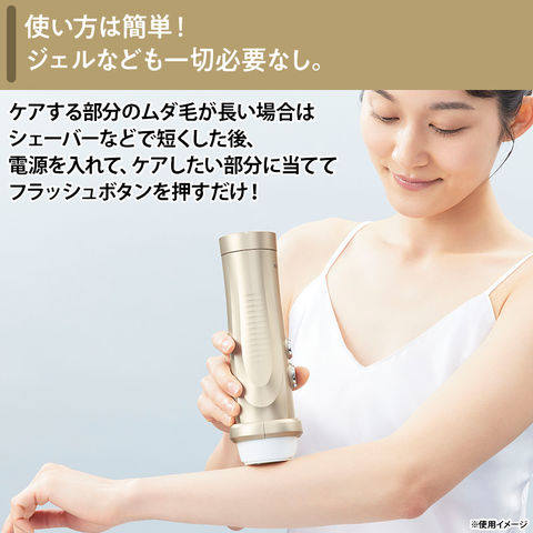 ジェルなども一切必要なし。ケアする部分のムダ毛が長い場合はシェーバーなどで短くした後、電源を入れて、ケアしたい部分に当ててフラッシュボタンを押すだけと、使い方は簡単!