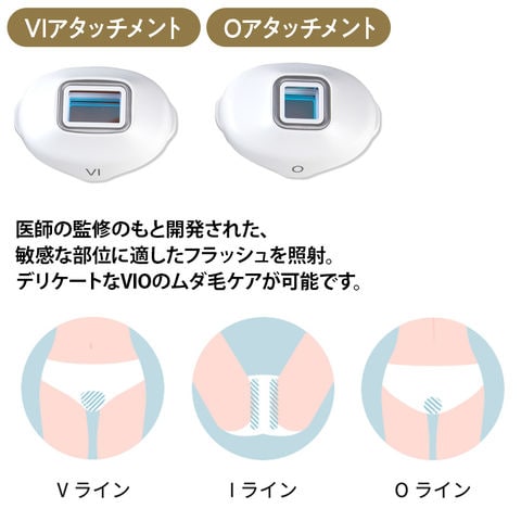 VIアタッチメント、またはOアタッチメントは、医師の監修のもと開発された、敏感な部位に適したフラッシュを照射。デリケートなVIOのムダ毛ケアが可能です。