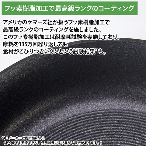 アメリカのケマーズ社が扱うフッ素樹脂加工で最高級ランクのコーティングを施しました。このフッ素樹脂加工は耐摩耗試験を実施しており、摩耗を135万回繰り返しても食材がこびりつきにくいという試験結果(*1)も。