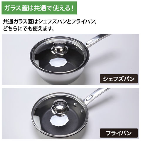 18cmフライパン、18cmシェフズパン(深型鍋)、共通ガラス蓋、レシピ
