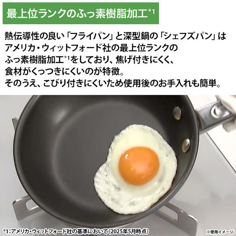 ■使い勝手がいい調理器具 熱伝導性の良い「フライパン」と深鍋の「シェフズパン」はアメリカ・ウィットフォード社の最上位ランクのふっ素樹脂加工(*1)をしており、焦げ付きにくく、食材がくっつきにくいのが特徴。そのうえ、こびり付きにくいため使用後のお手入れも簡単。