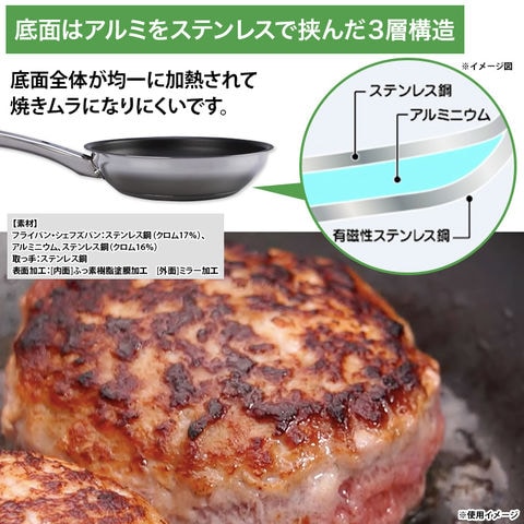 底面はアルミをステンレスで挟んだ3層構造。底面全体が均一に加熱されて焼きムラになりにくいです。