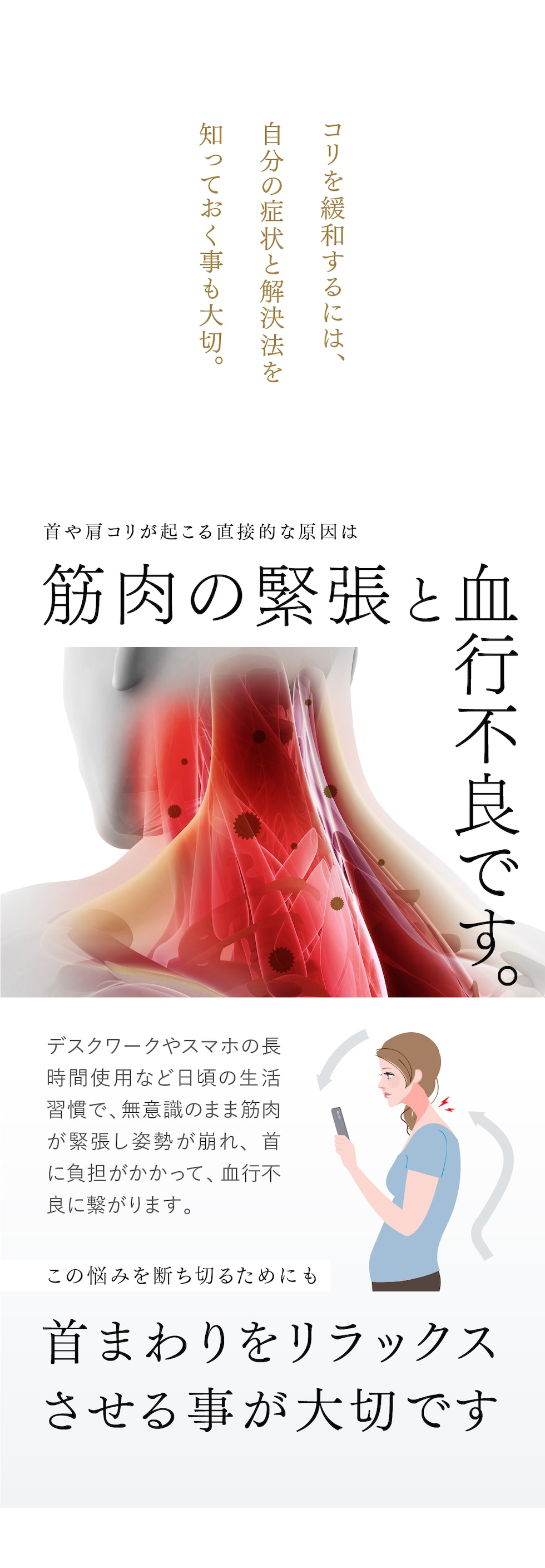 首・肩まわりの血行を促進し、コリや痛みを緩和します。