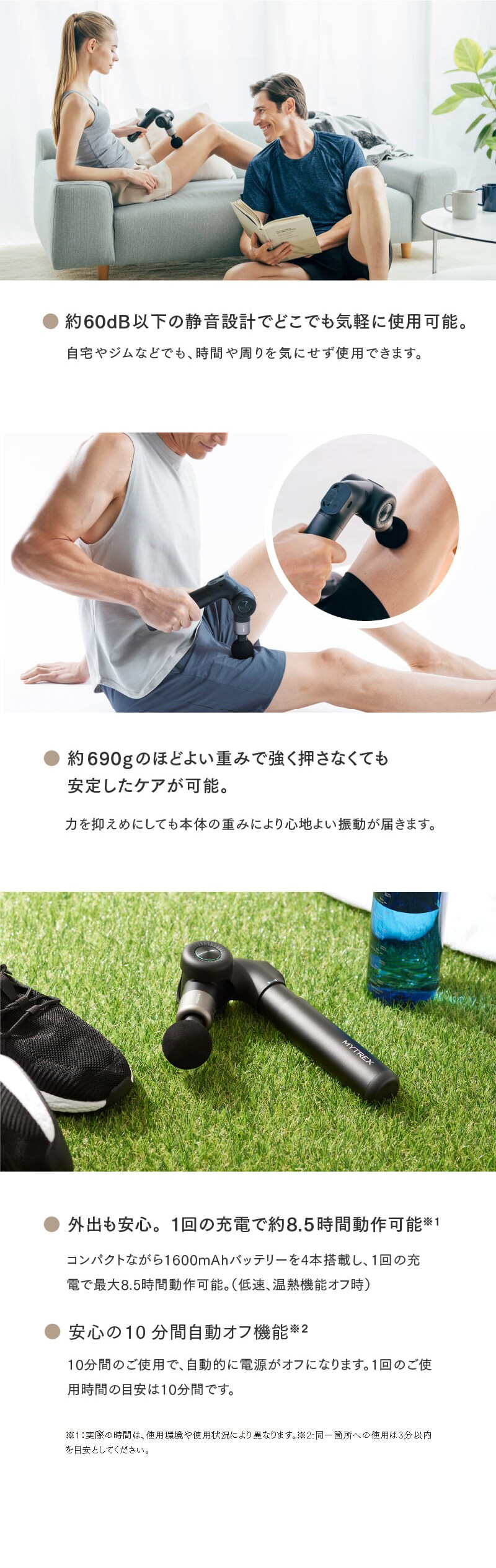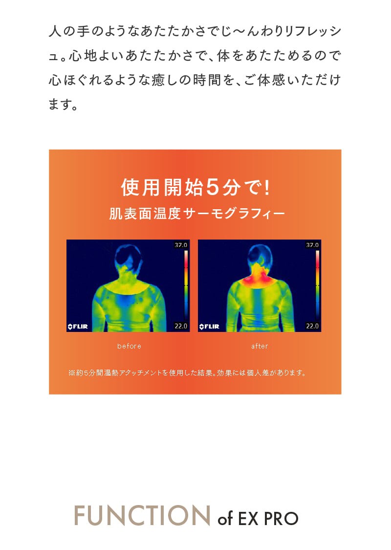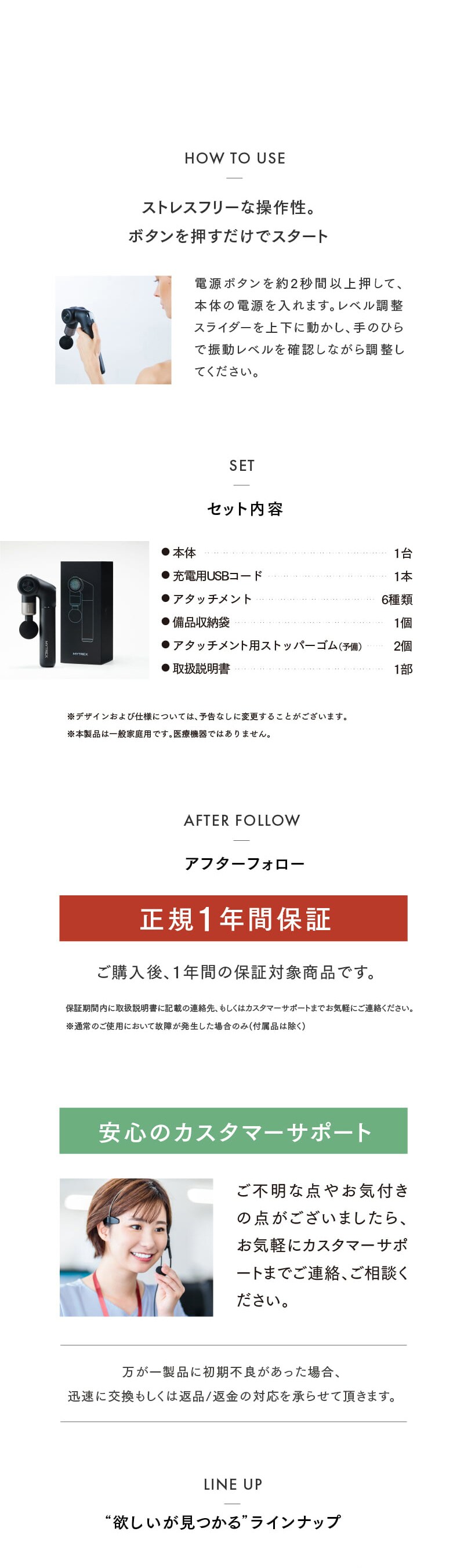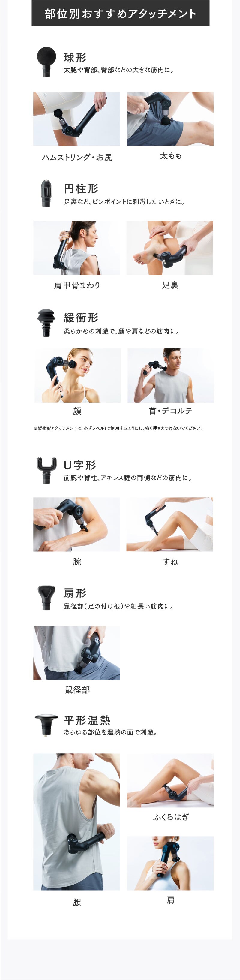 | ●素材 | 本体:PC-GF20、ABS樹脂、アルミニウム合金、アクリル、ステンレス、シリコンアタッチメント:ABS樹脂、シリコン、(温熱アタッチメントのみ次を含む:アルミニウム) |