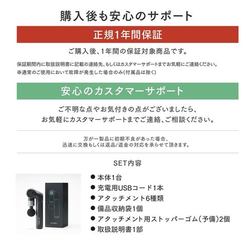 | ●パッケージ内容 | 本体×1・充電用USBコード×1・アタッチメント×6種類・取扱説明書(保証書)×1・備品収納袋×1・アタッチメント用ストッパーゴム(予備)×2 |