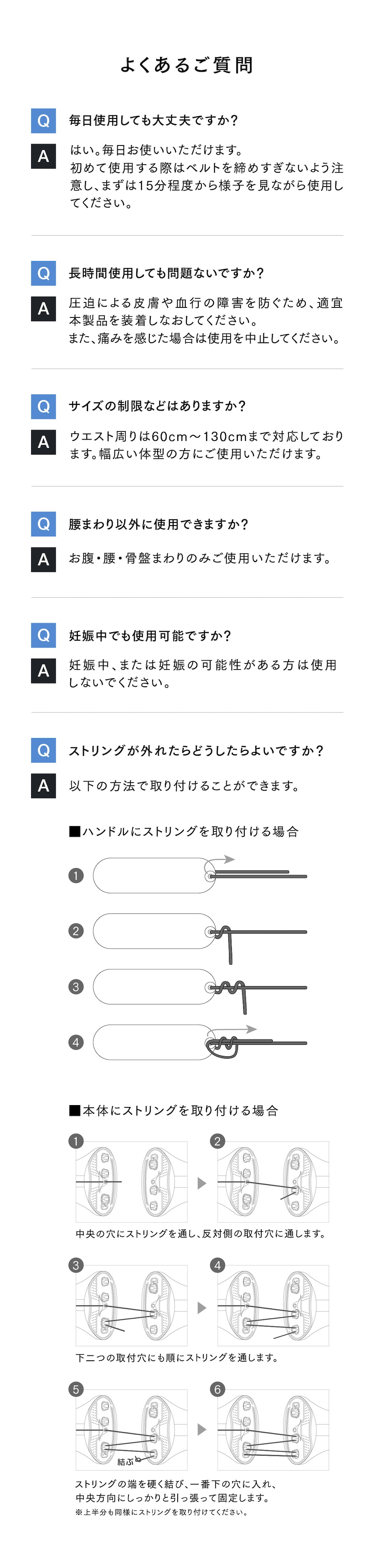 ・初めて使用する際はベルトを締めすぎないよう注意し、まずは15分程度から様子を見ながら使用してください。特にかぶれ、かゆみの出やすい方はご注意ください。