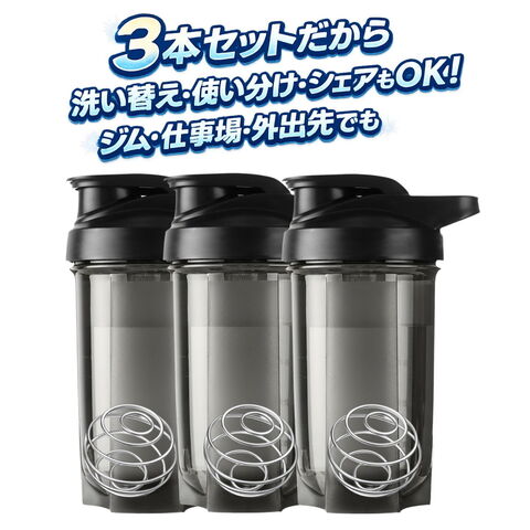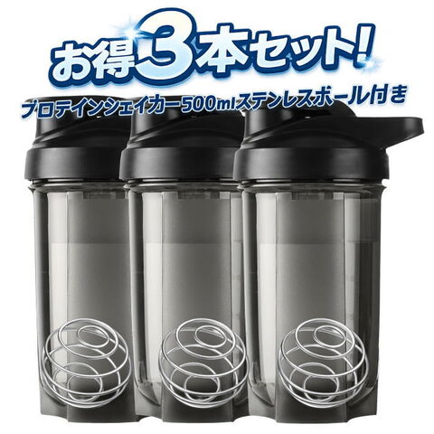 プロテインシェイカー 500ml 3本セット ステンレスボール付き 7986529 ダマにならない 密閉防漏 持ち運び便利 食洗機対応 フィットネス・筋トレ(3本セット,ブラック)
