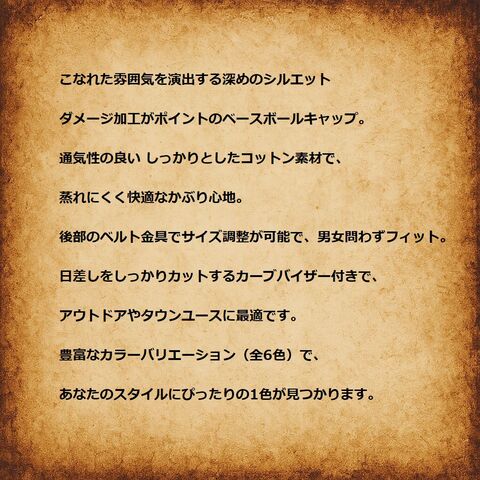 | 【ダメージ加工がCOOL】LA Los Angeles 帽子 キャップ Vintage メンズ レディース くすみカラー こなれ感 深め しっかり素材 ■特徴 こなれた雰囲気を演出するダメージ加工がポイントのベースボールキャップ。 通気性の良い しっかりとしたコットン素材で、蒸れにくく快適なかぶり心地。 後部のベルト金具でサイズ調整が可能なので、男女問わずフィット。 日差しをしっかりカットするカーブバイザー付きで、アウトドアやタウンユースに最適です。 豊富なカラーバリエーション(全6色)で、あなたのスタイルにぴったりの1色が見つかります。 ■カラー ブラック ワイン ベージュ グレー ブラウン カーキ ※カラーは各々のモニターにより、多少の違いがある事、ご了承下さいませ。 ■サイズ cm 後部ベルト調整 頭回り 56.0cm~60.0cm つばの長さ 7.5cm ■素材 コットン100% ■注意点 ※メーカーの製造ロット差で多少 デザインが変更になる場合があります。 ※海外輸入の商品になりますので多少の汚れ、傷がある場合があります。 |