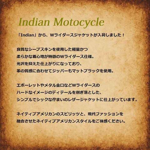 | 【本革】Indian Motocycle ライダースジャケット メンズ レディース ブランド インディアン インディアンモトサイクル ダブル 本革 革 羊革 シープスキン レザー ■特徴 「Indian」から、Wライダースジャケットが入荷しました! 良質なシープスキンを使用した軽量かつ柔らかな着心地が特徴のWライダース仕様。 光沢を抑えた仕上がりになっており、革の質感に合わせてジッパーもマットブラックを使用。 エポーレットやメタル金口などWライダースのハードなイメージのディテールを削ぎ落とした、シンプルでシックな佇まいのレザージャケットに仕上がっています。 ネイティブアメリカンのスピリッツと、現代ファッションを融合させたネイティブアメリカンスタイルをご体感ください。 ■カラー ブラック ※カラーは各々のモニターにより、多少の違いがある事、ご了承下さいませ。 ■サイズ cm M 着丈67 身幅53脇下より 肩幅44 袖丈62肩より L 着丈69 身幅56脇下より 肩幅47 袖丈64肩より XL 着丈70 身幅59脇下より 肩幅50 袖丈65肩より ■素材 表地:皮革(sheepskin)100% 裏地:POLYESTER 100% (ポリエステル) ■商品ご購入時のご注意 天然皮革を使用する製品のほとんどが、天然皮革ならではの風合いを生かして作られているため、 特性上、表面にキズ・色ムラ・シワがある場合がございます。これらは自然で生まれたものだからこそ味わえる、天然皮革の証です。 生前についた傷やシワなどを残した仕上げの革はエイジングを起こしやすく、時とともに美しい風合いへと変化します。 特性上、革の表面にはキズ・色ムラ・シワなどがございますが、良品となりますので予めご了承ください。 |