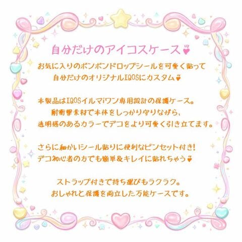 | 【4点セット/シールを貼ろう】新型/IQOS イルマ i ワン用 アイコス イルマiワン ILUMA ケース ピンセット付き 保護ケース iqosイルマワン イルマワンカバー 耐衝撃 おしゃれ iqos iluma one 専用 アイコスケース ボンボンドロップシールを貼ろう ■特徴 お気に入りのボンボンドロップシールを可愛く貼って 自分だけのオリジナルIQOSにカスタム♪ 本製品はIQOSイルマiワン専用設計の保護ケース。 耐衝撃素材で本体をしっかり守りながら、 透明感のあるカラーでデコをより可愛く引き立てます。 さらに細かいシール貼りに便利なピンセット付き! デコ初心者の方でも簡単&キレイに貼れるのが嬉しいポイント♪ ストラップ付きで持ち運びもラクラク。 おしゃれと保護を両立した万能ケースです。 ■カラー クリア ブルー ピンク ※カラーは各々のモニターにより、多少の違いがある事、ご了承下さいませ。 ■素材 プラスチック ■注意点 ※メーカーの製造ロット差で多少 デザインが変更になる場合があります。 ※海外輸入の商品になりますので多少の汚れ、傷がある場合があります。 #IQOSケース #イルマiワン #ILUMAiONE #アイコスケース #デコケース #推し活グッズ #ボンボンドロップシール #透明ケース #耐衝撃ケース #おしゃれIQOS #カスタムケース |