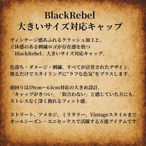 | 【当店限定/大きいサイズ】BlackRebel 帽子 キャップ メンズ レディース 大きいサイズ 深め Vintage クラッシュ 加工 こなれ感 おしゃれ ■特徴 ヴィンテージ感あふれるクラッシュ加工と、 立体感のある刺繍ロゴが存在感を放つ 「BlackRebel」大きいサイズ対応キャップ。 色落ち・ダメージ・刺繍、すべてが計算されたデザイン。 被るだけでスタイリングに“ラフな色気”をプラスします。 頭回りは59cm?63cm対応の大きめ設計。 「キャップがきつい」「似合わない」と感じていた方にも、 ストレスなく深く被れるフィット感。 ストリート、アメカジ、ミリタリー、ヴィンテージスタイルまで オールシーズン・ユニセックスで活躍する万能アイテムです。 ■カラー ブラック ネイビー カーキ ブラウン グレー ワイン ※カラーは各々のモニターにより、多少の違いがある事、ご了承下さいませ。 ■サイズ cm 後部ベルト調整 頭回り 59.0cm~63.0cm つばの長さ 7.5cm ■素材 コットン100% ■注意点 ※メーカーの製造ロット差で多少 デザインが変更になる場合があります。 ※海外輸入の商品になりますので多少の汚れ、傷がある場合があります。 #BlackRebel #大きいサイズ #ヴィンテージキャップ #クラッシュキャップ #刺繍キャップ #メンズ帽子 #ユニセックス #アメカジ #ストリートファッション #古着コーデ #被るだけで決まる |