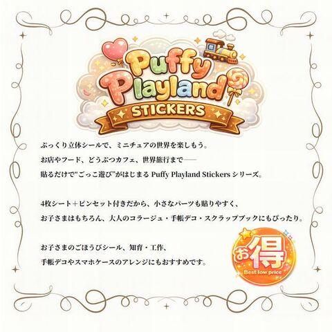 | ■特徴 ぷっくり立体シールで、ミニチュアの世界を楽しもう。 お店やフード、どうぶつカフェ、世界旅行まで―― 貼るだけで“ごっこ遊び”がはじまる Puffy Playland Stickers シリーズ。 4枚シート+ピンセット付きだから、小さなパーツも貼りやすく、 お子さまはもちろん、大人のコラージュ・手帳デコ・スクラップブックにもぴったり。 お子さまのごほうびシール、知育・工作、 手帳デコやスマホケースのアレンジにもおすすめです。 ■カラー 1.食べ物シール4種類 2.ショップシール4種類 3.動物&食べ物シール4種類 4.お国シール4種類 ※カラーは各々のモニターにより、多少の違いがある事、ご了承下さいませ。 ■サイズ cm 横9.5×縦20.0 ■素材 PVC 粘着シール ■注意点 ※メーカーの製造ロット差で多少 デザインが変更になる場合があります。 ※海外輸入の商品になりますので多少の汚れ、傷がある場合があります。 #可愛いシール #子ども用シール #ごほうびシール #手帳デコ #デコレーション #知育アイテム #プレゼントにおすすめ |