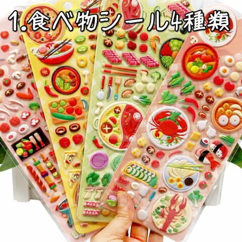 【お得な4枚シート/ピンセット付き】Puffy Playland Stickers シール 立体シール NEKO 7986569 ぷくぷくシール デコシール 可愛いステッカー 福袋 手帳(4枚セット,3.動物&食べ物シール4種類)