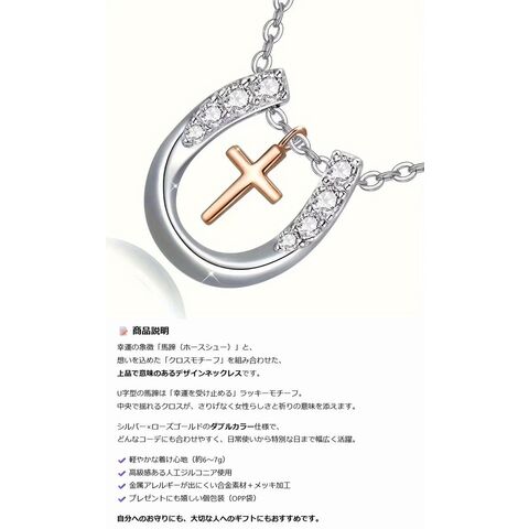 | 【幸運の象徴 馬蹄ホースシュー】馬 蹄 ホース ネックレス 馬蹄 レディース シルバー アクセサリー おしゃれ きれいめ 金アレ対応 シンプル プレゼント ギフト ■特徴 幸運の象徴「馬蹄(ホースシュー)」と、 想いを込めた「クロスモチーフ」を組み合わせた、 上品で意味のあるデザインネックレスです。 U字型の馬蹄は「幸運を受け止める」ラッキーモチーフ。 中央で揺れるクロスが、さりげなく女性らしさと祈りの意味を添えます。 シルバー×ローズゴールドのダブルカラー仕様で、 どんなコーデにも合わせやすく、日常使いから特別な日まで幅広く活躍。 ✔ 軽やかな着け心地(約6〜7g) ✔ 高級感ある人工ジルコニア使用 ✔ 金属アレルギーが出にくい合金素材+メッキ加工 ✔ プレゼントにも嬉しい個包装(OPP袋) 自分へのお守りにも、大切な人へのギフトにもおすすめです。 ■カラー シルバー×ゴールド ※カラーは各々のモニターにより、多少の違いがある事、ご了承下さいませ。 ■サイズ cm 長さは約:44cm+アジャスター4cm ■素材 合金+人工ジルコニア(表面メッキ加工) ■注意点 ※メーカーの製造ロット差で多少 デザインが変更になる場合があります。 ※海外輸入の商品になりますので多少の汚れ、傷がある場合があります。 #馬蹄ネックレス #ホースシューネックレス #クロスネックレス #お守りアクセサリー #幸運モチーフ #レディースネックレス #大人可愛い #ギフトにおすすめ #デイリーアクセサリー |