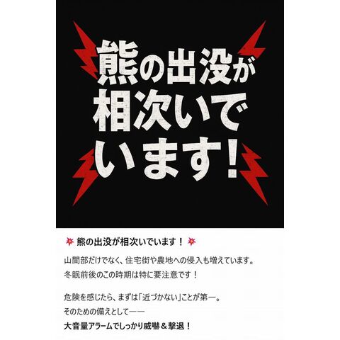 | 【熊対策/大音量】 熊対策!熊避け!大音量アラーム&ライト 120dB 害獣避け 害鳥避け 害獣対策 くま避け 熊よけ べアBEAR クマよけ 熊避け 熊・猪などの野生動物対策に アウトドア キャンプ 登山 ハイキング トレッキング アクセサリー 非常用 緊急用 笛 防犯 防災グッズ 送料無料 ■特徴・商品説明 ★高輝度XPE LEDチップ搭載 最新の高性能XPEチップを採用し、驚くほど明るい照射力を実現。 リフレクターで光を集中させ、夜道やキャンプ場でもしっかり照らします。 ★120dBの大音量アラーム 熊・イノシシ・サルなどの害獣対策に最適! 緊急時には120dBの強力サウンドで威嚇&撃退。 「長音・短音・静音」の3段階モードでシーンに合わせた使い分けが可能。 ★IPX54防水設計 小雨・水しぶき・湿気にも強い設計で、屋外使用も安心。 ★USB Type-C急速充電 5V安全電圧でスピーディーに充電可能。 モバイルバッテリーからの充電にも対応。 ★コンパクト&軽量ボディ 携帯性に優れ、登山、キャンプ、防災、防犯、通勤通学時の護身用など、幅広く活躍します。 製品サイズ:2.5 × 13.8 cm 正味重量:66 g 材質:アルミ合金 音量:120 dB スイッチ:照明スイッチ、電子ブザー音スイッチ バッテリー:ポリマーリチウム電池 充電方式:TYPE-C 充電 モード:電源ボタンを3秒長押しで起動 「強光 → 点滅」切り替え アラームモード:長押しでアラーム音、ボリュームはスイッチで切り替え 防水等級:IP54 ※当商品は熊との遭遇率を100%下げる効果を保証するものではありません。 ※近距離では熊の忌避には効果がありません。 ※クマに出会ってしまったら、走って逃げたり大声を出したりせず、 静かにゆっくりと後退し、クマから目を離さないようにします。 子グマを見かけても、必ず近くに親グマがいるので近寄ってはいけません。 攻撃されそうな場合は、両手で頭部や首の後ろを覆い、うつぶせになって防御します。 ■仕様 本体×1 収納ケース×1 ネックストラップ×1 ハンドストラップ×1 充電ケーブル(TYPE-A/TYPE-C) 取扱説明書×1 ・リチウム電池/500mAh ・充電時間:約2時間 ・連続作動時間:約60分 ■カラー ブラック ※カラーは各々のモニターにより、多少の違いがある事、ご了承下さいませ。 ■サイズ cm 直径2.5cm 長さ13.8cm ■素材 アルミ合金 ■注意点 ※メーカーの製造ロット差で多少 デザインが変更になる場合があります。 ※海外輸入の商品になりますので多少の汚れ、傷がある場合があります。 |