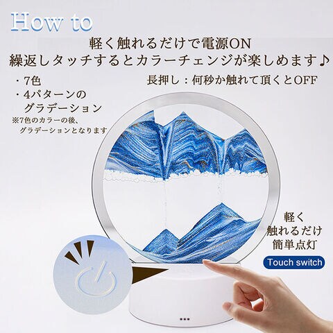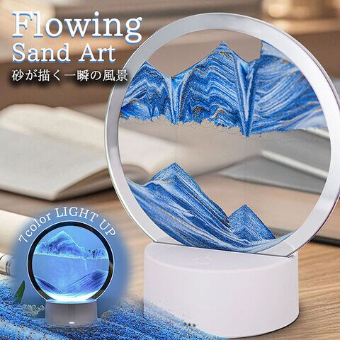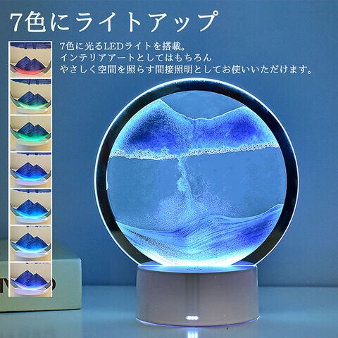 | 【幻想的でおしゃれ】サンドアートピクチャー インテリア 置物 癒し 動く砂 アートフレーム 卓上 リラックス 間接照明 ■特徴 砂が描く、一瞬だけの風景。 ガラスフレームの中を、色とりどりの砂がゆっくりと流れ落ち、 山や砂丘、波のような幻想的な風景を描くサンドアートピクチャー ひっくり返すたびに生まれる、世界にひとつの風景。 ふと見入ってしまう、 忙しい日常に、そっと癒しを添えるインテリア 7色にライトアップ 7色に光るLEDライトを搭載。 インテリアアートとしてはもちろん やさしく空間を照らす間接照明としてお使いいただけます! 軽く触れるだけ、タッチ操作、軽く触れてON、7カラーチェンジ 4パターンのグラデーションが楽しめます♪ 長押しでOFF、何秒か触れるだけ簡単操作! USB給電と乾電池、選べる2WAY電源 コードありでも、コードなしでも 好きな場所に飾れる自由さが魅力的♪ ※充電はできません、コンセントからのご使用の場合は、別途USB-ACアダプターが必要となります。 ブルー系の色には、視覚的に心を落ち着かせ、リラックスした印象を与える効果が あるともされています。砂は水の中をゆっくり漂うように流れ落ち、 細かな粒が重なり合いながら幻想的な景色を描き出します。 ブルーの濃淡が奥行きを演出し、ホワイトが霞のように広がり、ゴールドが光の アクセントとしてきらめくことで、夜の海や星明かりを思わせる神秘的な雰囲気に。 サンドアートの模様を作り出すポイントは、 砂だけでなく「気泡」の動き。 フレーム内の気泡がゆっくり移動することで、 水の流れが変化し、砂の落ち方や積もり方が毎回異なります。 世界にひとつの幻想的なアートをお楽しみいただけます。 砂の流れのポイント! 気泡が少ない部分から砂が流れ落ちやすくなるため、同じ動きを繰り返しても、二度と同じ景色になりません。 空気層のバランスを調整して出荷しておりますので、通常は空気と水の調整は必要ありません。 水・気泡の追加ができません。出荷時の気泡の高さは約1~2.0cm程度です。 砂の流れが悪いと思われる場合は、周囲に気を付け、砂の塊をほぐすように何度か振って下さい。 同様に気泡が細かくなると砂の流れが少し良くなります。 気泡をフラットにし一度砂の流れを止めてから、傾け気泡を左右に調節するときれいな模様になりやすいです。 ※ご注意※ ・本体はガラス製のため、落下や強い衝撃を与えないようご注意ください。 台座への差し込みが甘いと破損の原因となります。しっかり奥まで差し込んでください。 ・砂の流れ方や模様の出方は、気泡の位置や量により個体差があります。商品の特性としてお楽しみください。 ・USB給電・乾電池使用時ともに、水濡れや高温多湿の場所での使用は避けてください。 ・小さなお子様やペットの手の届かない場所でご使用ください。 ・分解・改造は故障の原因となりますのでおやめください。 ■カラー ブルー ※カラーは各々のモニターにより、多少の違いがある事、ご了承下さいませ。 ■サイズ cm ガラスパネル:16cm 台座:10cm 高さ:組み合わせ全長20cm ※実寸に於いては多少の誤差がありますがご了承下さいませ。 ■素材 ガラス、ABS樹脂 注意点 ※メーカーの製造ロット差で多少 デザインが変更になる場合があります。 ※海外輸入の商品になりますので多少の汚れ、傷がある場合があります。 #サンドアート #癒しインテリア #間接照明 #おしゃれライト #ヒーリング #ギフト #リラックス #デスクライト #ナイトライト #インテリア雑貨 |
