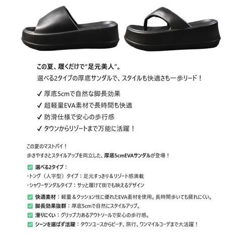 | 【5cm厚底/履くだけで足元美人】 シャワーサンダル トングサンダル サンダル レディース メンズ 厚底 5cmアップ 美脚 防滑 軽量 おしゃれ 人字サンダル 黒 クロ BLACK 韓国ファッション ■特徴 この夏のマストバイ! 歩きやすさとスタイルアップを両立した、厚底5cmEVAサンダルが登場! 〇選べる2タイプ: ・トング(人字型)タイプ:足元すっきり&リゾート感満載 ・シャワーサンダルタイプ:サッと履けて街でも映えるデザイン 〇快適素材:軽量&クッション性に優れたEVA素材を使用。長時間歩いても疲れにくい。 〇脚長効果抜群:厚底5cmで自然にスタイルアップ。 〇滑りにくい:グリップ力あるアウトソールで安心の歩行感。 〇シーンを選ばず活躍:タウンユースからビーチ、旅行、ワンマイルコーデまで大活躍! 【Q&Aセクション】 Q. サイズ感はどうですか? A. 通常のサイズで問題ありません。 甲高や幅広の方はワンサイズ上をおすすめします。 Q. 素材は硬くありませんか? A. EVA素材を使用しており、とても柔らかく足にフィットします。 履いた瞬間から“ふわっ”とした履き心地です。 Q. 滑りやすくありませんか? A. 滑りにくいアウトソール設計です。 水場や石畳でも安心して歩けます。 Q. お手入れ方法は? A. 水に強い素材なので、サッと拭くだけでOK! アウトドアや海辺でも気軽に使えます。 Q. どんな服に合いますか? A. ワンピース、デニム、セットアップなど幅広いスタイルに対応。 春夏のコーデをぐっと垢抜けさせる万能サンダルです! ■カラー トングタイプ シャワータイプ ※カラーは各々のモニターにより、多少の違いがある事、ご了承下さいませ。 ■サイズ cm 23.0~23.5 24.0~24.5 25.0~25.5 ■素材 EVA ■注意点 ※メーカーの製造ロット差で多少 デザインが変更になる場合があります。 ※海外輸入の商品になりますので多少の汚れ、傷がある場合があります。 |