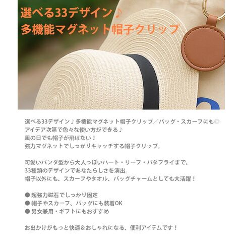 | 【超協力マグネット/選べる33種】帽子クリップ ハットクリップ キャップクリップ 帽子収納ホルダー 収納フック キーホルダー 強力マグネット レザー調 アクセサリー チャーム キーリング キーケース ■特徴 選べる33デザイン♪多機能マグネット帽子クリップ/バッグ・スカーフにも◎ アイデア次第で色々な使い方ができる♪ 風の日でも帽子が飛ばない! 強力マグネットでしっかりキャッチする帽子クリップ。 可愛いパンダ型から大人っぽいハート・リーフ・バタフライまで、 33種類のデザインであなたらしさを演出。 帽子以外にも、スカーフやタオル、バッグチャームとしても大活躍! ● 超強力磁石でしっかり固定 ● 帽子やスカーフ、バッグにも装着OK ● 男女兼用・ギフトにもおすすめ お出かけがもっと快適&おしゃれになる、便利アイテムです! ■カラー 1~33 ※カラーは各々のモニターにより、多少の違いがある事、ご了承下さいませ。 ■サイズ cm 画像参照 ■素材 合成皮革 合金 ■注意点 ※メーカーの製造ロット差で多少 デザインが変更になる場合があります。 ※海外輸入の商品になりますので多少の汚れ、傷がある場合があります。 |