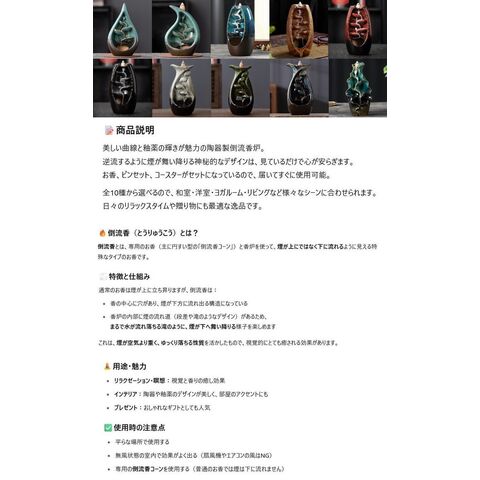| 【お得なオマケ付/すぐに使える】倒流香 倒流香炉 お香 アロマ お香立て コーン incense インテリア オブジェ リラックス ヨガ 雑貨 陶器 おしゃれ プレゼント ギフト ■特徴 美しい曲線と釉薬の輝きが魅力の陶器製倒流香炉。 逆流するように煙が舞い降りる神秘的なデザインは、見ているだけで心が安らぎます。 お香、ピンセット、コースターがセットになっているので、届いてすぐに使用可能。 全10種から選べるので、和室・洋室・ヨガルーム・リビングなど様々なシーンに合わせられます。 日々のリラックスタイムや贈り物にも最適な逸品です。 ■倒流香とは 倒流香とは、煙が下に流れる特殊なお香のことで、煙が水のように流れるような幻想的な光景を楽しむことができます。 煙の逆流:通常のお香は煙が上に向かって立ち上りますが、倒流香は底に穴があり、 燃焼すると煙が冷却され、密度が高くなって下に流れるように見える設計 ■カラー A B C D E F G H I J ※カラーは各々のモニターにより、多少の違いがある事、ご了承下さいませ。 ■サイズ cm 画像参照 ■素材 陶器 ■注意点 ※メーカーの製造ロット差で多少 デザインが変更になる場合があります。 ※海外輸入の商品になりますので多少の汚れ、傷がある場合があります。 |