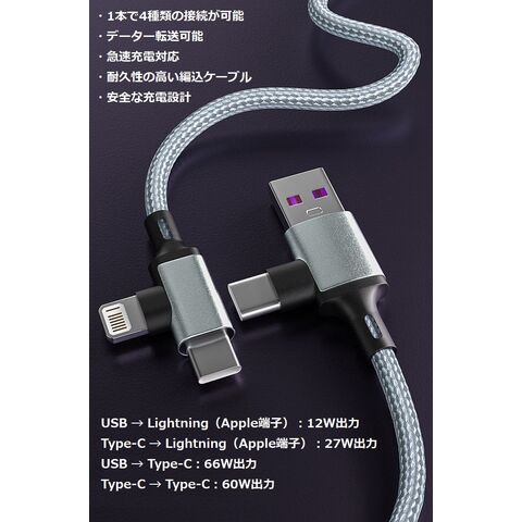 爆速 4-in-1 PD60w対応 スマホ ケーブル C-TO-C Type-C to C ライトニング NEK 7986792 2本セット データ転送 1cm~2m iPhone 3A 急速 充電器 IQOS(2.0m,シルバー系(2個セット))