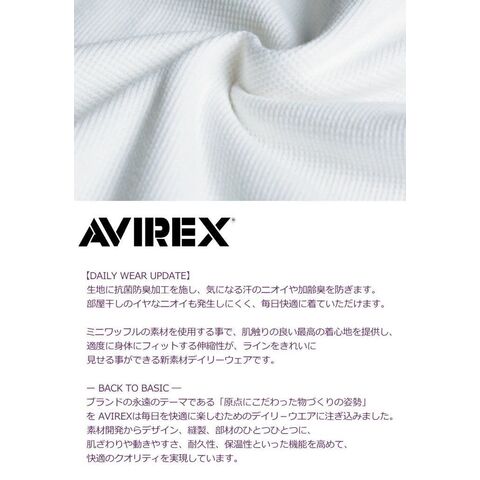 | AVIREX ワッフル Tシャツ メンズ 正規品 MINI WAFFLE V-NECK CREW-NECK S/S T-SHIRT ブランド おしゃれ 無地 ストレッチ アビレックス アヴィレックス Vネック 7833134007 7835934008 7833134008 7835934009 ■特徴 【DAILY WEAR UPDATE】 生地に抗菌防臭加工を施し、気になる汗のニオイや加齢臭を防ぎます。 部屋干しのイヤなニオイも発生しにくく、毎日快適に着ていただけます。 コンフォータブルな日常着として開発した デイリーライン「AVIREX DAILY WEAR」。 テンションの強いライクラ糸を入れたリブ編み素材を採用。 しっかりした風合いが特徴でヘビーローテーションでの着用にも耐えうる耐久性を兼ね備えている。 タイトなフィット感が特徴です。 ー BACK TO BASIC ― ブランドの永遠のテーマである「原点にこだわった物づくりの姿勢」を AVIREXは毎日を快適に楽しむためのデイリ-ウエアに注ぎ込みました。 素材開発からデザイン、縫製、部材のひとつひとつに、肌ざわりや動きやすさ、耐久性、保温性といった機能を高めて、快適のクオリティを実現しています。 ■カラー ※Vネック ホワイト ブラック グレー ※クルーネック ホワイト ブラック グレー ※カラーは各々のモニターにより、多少の違いがある事、ご了承下さいませ。 ■サイズ cm S 着丈64 胸囲84 肩幅42 袖丈18 M 着丈67 胸囲90 肩幅45 袖丈19 L 着丈69 胸囲94 肩幅46 袖丈19 XL 着丈71 胸囲98 肩幅48 袖丈20 ※モデルANI 165cm 50kg Sサイズ着用 ※モデルYAS 175cm 64kg XLサイズ ■素材 綿95% ポリウレタン5% |