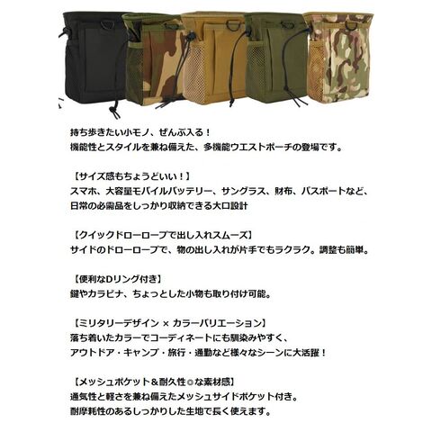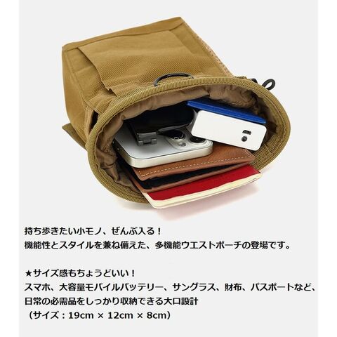 | 【多機能ミリタリー】ウエストポーチ ポーチ メンズ レディース 収納力抜群 アウトドア 散歩 旅行 キャンプ サバゲー 日常 ■特徴 持ち歩きたい小モノ、ぜんぶ入る! 機能性とスタイルを兼ね備えた、多機能ウエストポーチの登場です。 ★サイズ感もちょうどいい! スマホ、大容量モバイルバッテリー、サングラス、財布、パスポートなど、 日常の必需品をしっかり収納できる大口設計(サイズ:19cm × 12cm × 8cm) ★クイックドローロープで出し入れスムーズ サイドのドローロープで、物の出し入れが片手でもラクラク。調整も簡単。 ★便利なDリング付き 鍵やカラビナ、ちょっとした小物も取り付け可能。 ★ミリタリーデザイン × カラーバリエーション 落ち着いたカラーでコーディネートにも馴染みやすく、 アウトドア・キャンプ・旅行・通勤など様々なシーンに大活躍! ★メッシュポケット&耐久性◎な素材感 通気性と軽さを兼ね備えたメッシュサイドポケット付き。 耐摩耗性のあるしっかりした生地で長く使えます。 ■仕様 大口×1 前面ベルクロポケット×1 前面Dリング×1 サイドメッシュポケット×1 サイドオープンポケット×1 後部ベルト×2 ウェビング×4 ■カラー ブラック カーキ オリーブ オリーブカモ カーキカモ ※カラーは各々のモニターにより、多少の違いがある事、ご了承下さいませ。 ■サイズ cm 横12×縦19×マチ8 約150g ■素材 600Dポリエステル 防水 ■注意点 ※メーカーの製造ロット差で多少 デザインが変更になる場合があります。 ※海外輸入の商品になりますので多少の汚れ、傷がある場合があります。 |