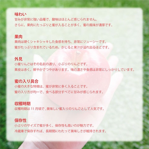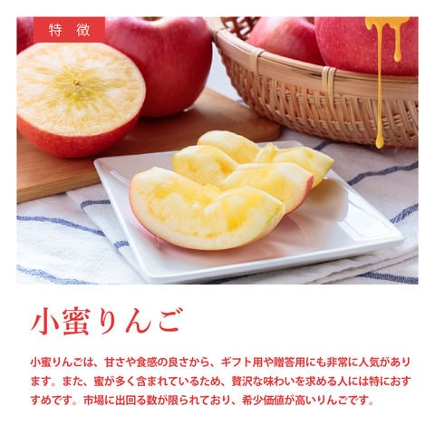 小蜜りんごは、その甘さや食感の良さから、ギフト用や贈答用にも非常に人気があります。また、蜜が多く含まれているため、贅沢な味わいを求める人には特におすすめです。市場に出回る数が限られており、希少価値も高い 味わい:甘みが非常に強い品種で、酸味はほとんど感じられません。甘党には特に好まれる味わいで、食べると口いっぱいに甘さが広がります。さらに、果肉にたっぷりと蜜が入ることが多く、蜜の風味が濃厚です。 果肉:果肉は硬くシャキシャキした食感を持ち、非常にジューシーです。蜜がたっぷり含まれているため、かじると果汁が溢れ出るほどです。 外見:小蜜りんごはその名前の通り、小ぶりのりんごです。果皮は赤く、鮮やかでつやがあります。見た目は小さいですが、味の濃さや食感は非常にしっかりしています。 蜜の入り具合:小蜜の大きな特徴は、蜜が非常に多く入ることです。蜜の入り方が均一で、食べる部分すべてに甘みが感じられます。 収穫時期:小蜜りんごの収穫時期は11月頃で、秋の終わりから冬にかけて市場に出回ります。冬に美味しい蜜入りのりんごとして人気です。 保存性:小ぶりのサイズで蜜が多く、保存性も高いのが魅力です。冷蔵庫で保存すれば、長期間にわたって美味しさが維持されます。 |